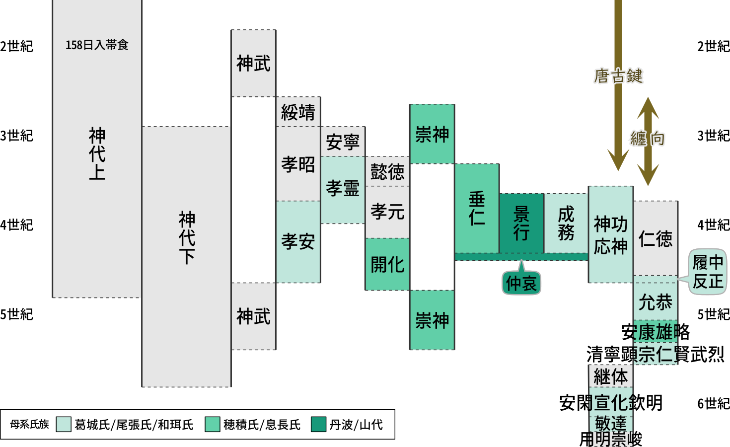 日本書紀は、履中[17]皇后(草香幡梭)の生んだ中蒂姫を安康[20]皇后と記す。