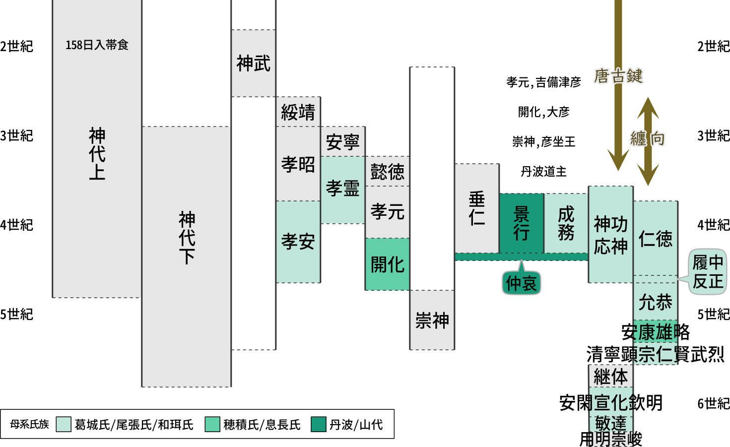母方の祖が穂積氏に通じる天皇は、開化[9]と安康[20]と雄略[21]。いずれの治世も4世紀後期から5世紀後期の範囲内だ。