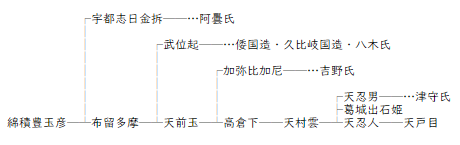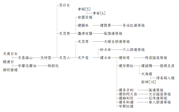 天照國照彥火明櫛玉饒速日尊 天道日女命爲妃 天上誕生天香語山命 御炊屋姫命爲妃 天降誕生宇摩志麻治命