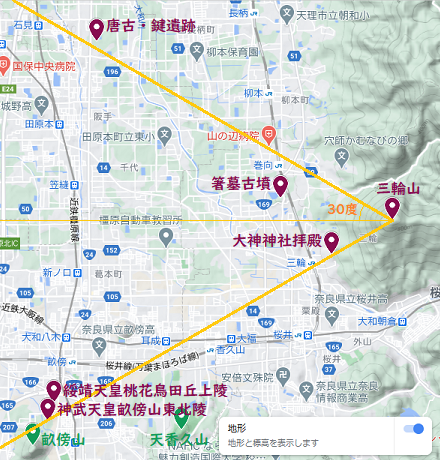 三輪山山頂から30度ずれた線を地図に引いてみると、冬至には唐子・鍵遺跡が線と重なり、夏至には大神神社拝殿と神武天皇陵が線と重なる。