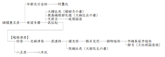 先代旧事本紀巻十の国造本紀は、神武[1]朝に椎根津彦を大倭国造に定めたと記し、崇神[10]朝には椎根津彦の後裔を久比岐国造に、神八井耳(神武皇子)の後裔を科野国造・火国造に任命したと記す。