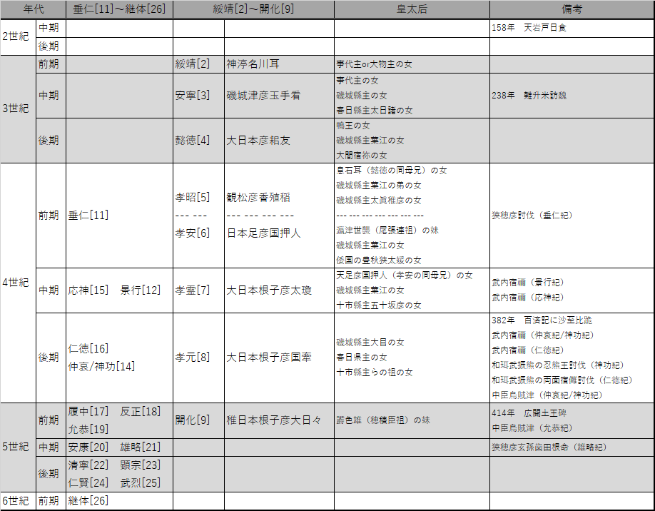 初期天皇年代表を微調整 天香山命あれやこれや 2022年10月12日 複数勢力の寄せ集めである神武[1]を除外。 備考欄に中臣烏賊津を追加。 中臣烏賊津は仲哀[14]紀、神功紀、允恭[19]紀に登場する。 武内宿祢同様に、この年代表ならば活動年代を約70年間に絞り込める。 * * *PR