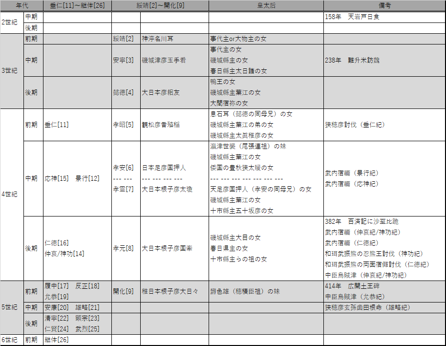 4世紀後期は孝元[8]と仲哀/神功[14]、仁徳[14]の世代。
